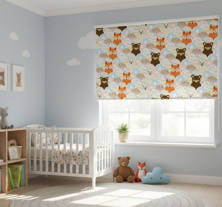Children room roller blind with bear and fox design