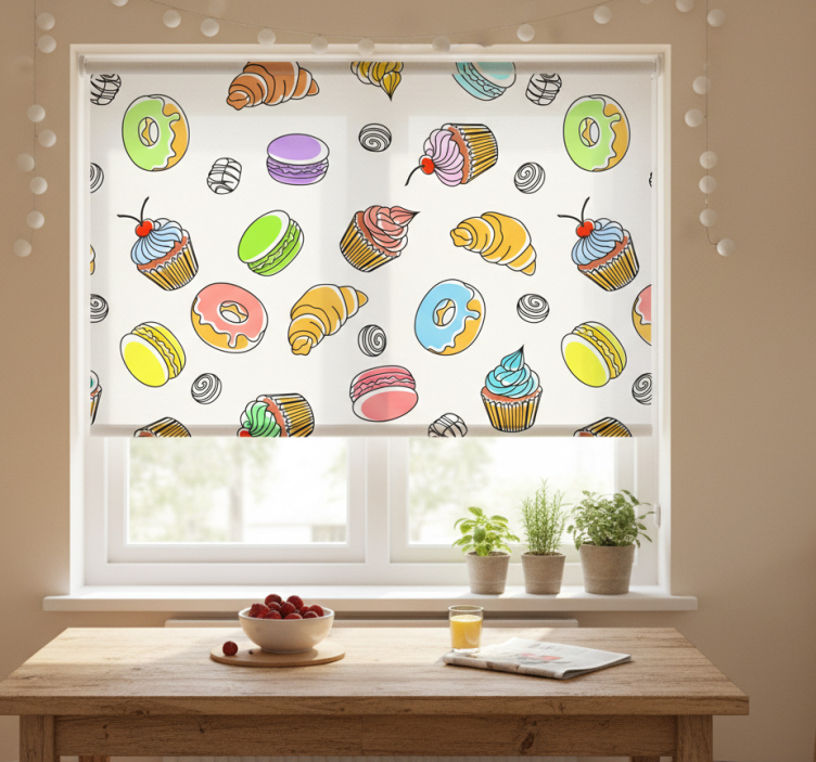 The Kitchen roller blind for delightful pastries kitchen roller blind elevates your kitchen's aesthetic, transforming it into a delightful space for culinary creativity! Imagine baking pastries with the perfect ambiance, thanks to the stylish design that complements your kitchen decor. Not only does it enhance visual appeal, but it also serves a practical purpose by regulating room temperature and ensuring your space remains cozy and inviting. Let your kitchen reflect your personality and taste with this charming addition!