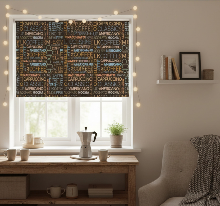 Reference: E6508Introducing our stunning Kitchen roller blind with coffee text design, a perfect blend of style and functionality! This visually captivating roller blind showcases an elegant coffee-themed text design that adds a warm and inviting atmosphere to your kitchen. With its easy assembly in just two clicks, effortless cleaning, and the ability to regulate room temperature, this roller blind is both practical and aesthetically pleasing. Enjoy privacy when needed, while still being able to enjoy the view outside. Crafted with 100% customisable measurements and available in three textures for varying light and privacy preferences, this roller blind is a perfect choice for any coffee lover!