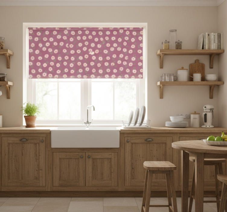 Transform your space with our Kitchen roller blind with little pink daisies pattern, featuring an enchanting design that showcases delicate pink daisies set against a soft backdrop. This delightful pattern breathes life into any kitchen, effortlessly combining charm and functionality. Enjoy the perfect blend of aesthetics and utility with easy assembly in just two clicks, and revel in the ease of cleaning and maintaining your blind, ensuring it stays vibrant and fresh.
