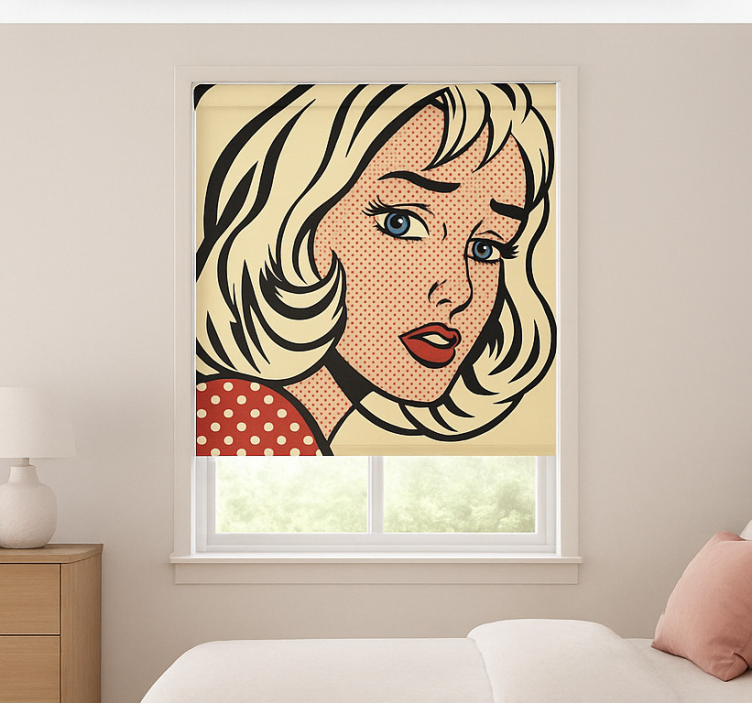Reference: E5992Transform your teenager's room with the Teenage bedroom roller blind pop art girl design. This stunning roller blind showcases a vibrant pop art girl graphic that bursts with color and personality. The design features a playful aesthetic that not only enhances the decor but also brings a sense of joy and creativity to the space. With easy assembly in just two clicks, effortless cleaning, and the ability to disassemble quickly for thorough window cleaning, this roller blind is perfectly designed for the modern lifestyle. It protects the room from direct sunlight, ensures privacy when lowered, and helps regulate the temperature, making it a practical and stylish addition to any teenage bedroom.