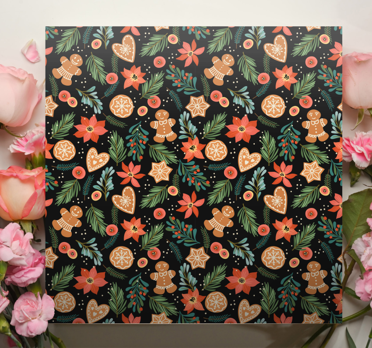 Reference: Q6490Festive elements feature gingerbread figures, hearts, and poinsettia blooms, all adorned with vibrant foliage. This pattern encapsulates a cheerful holiday spirit with delightful details, including decorative stars and orange slices that enhance the overall seasonal theme.