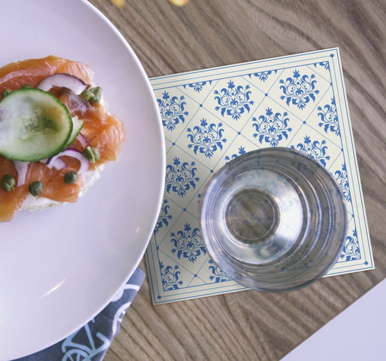 to showcase your elegant and classy decoration style. The magnificent flower design in the timeless blue color will seamlessly complement your existing decor. The trendy off-white background adds a touch of chicness. Rest assured, these coasters can withstand spills and can be easily cleaned. This design will elevate the aesthetics of yourdining or kitchen table