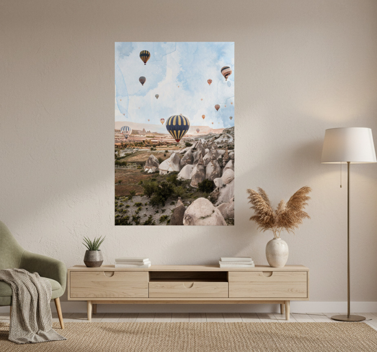Reference: G1110Introducing the stunning Cappadocia air balloons city poster, a breathtaking piece of art that captures the enchanting beauty of Cappadocia's iconic air balloons soaring over its unique landscape. This design features a vibrant array of colors that evoke a sense of adventure and wonder, complemented by a semi-matt finish that enhances its high colour intensity without reflections.