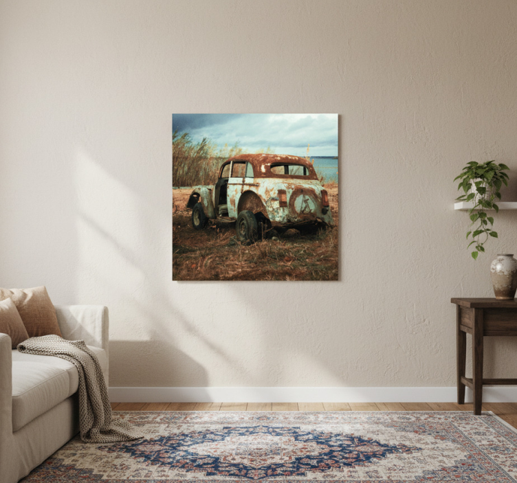 Living room poster of an old dirty car in the fields