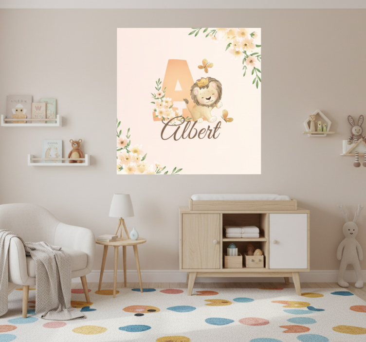 Reference: G956Introducing our enchanting Nursery poster cute animals lioness with name, a delightful addition to any child's room that features a stunning design. The poster showcases a beautifully illustrated lioness surrounded by vibrant colors, crafted on high-quality 180g/m2 paper with a semi-matt finish that ensures there are no reflections, allowing the artwork to shine in all its high color intensity.