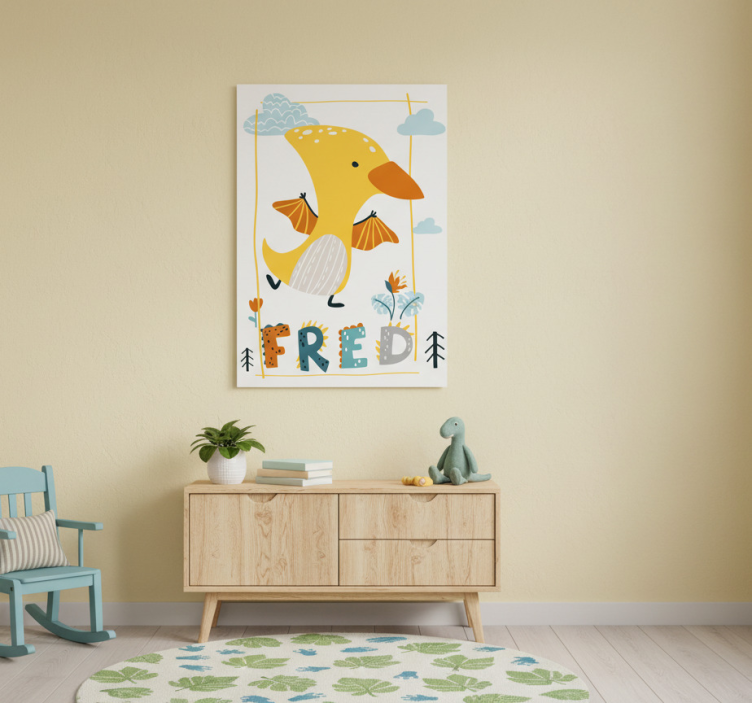 Placing the Nursery poster of a playful yellow pterosaur children wall poster is simple and fun! The best option is to use double-sided adhesive tape on the back of the poster. You can also frame it for a polished look or use stronger adhesives for a secure hold. Just stick the strips to the back and hold each strip firmly for 10 seconds. Alternatively, consider using thumbtacks or reusable blu-tack, which can be applied like tape for easy adjustments!