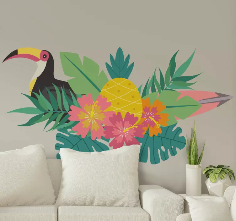 Transform your space with our stunning Animal wall decal tropical bird design featuring a vibrant toucan surrounded by lush greenery, colorful flowers, and playful pineapples. This eye-catching design brings a tropical vibe into any room, infusing it with lively colors and an exotic feel that captivates the imagination!
