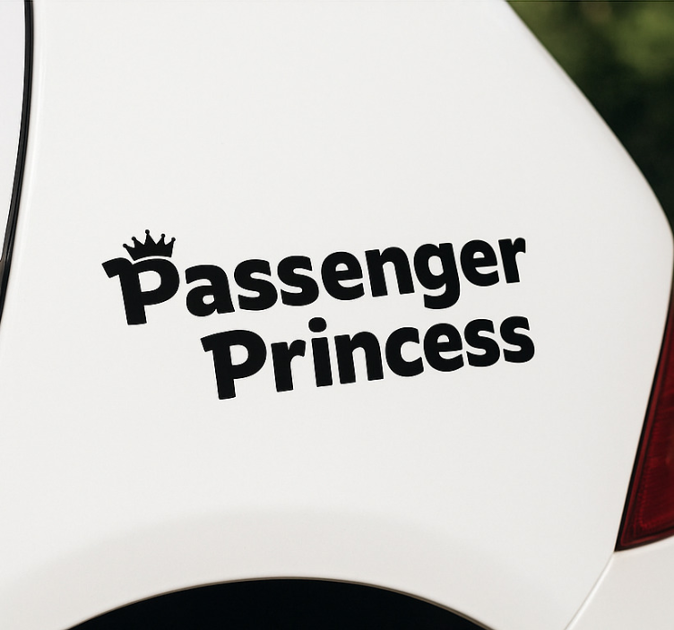 Reference: A53967Introducing the Passenger princess car decal, a beautifully designed car accessory that adds a touch of personality to your vehicle! This striking decal features elegant typography and playful graphics that celebrate the joy of being the passenger. With its vibrant colors and glossy finish, it’s sure to catch the eye and bring a smile to everyone who sees it!