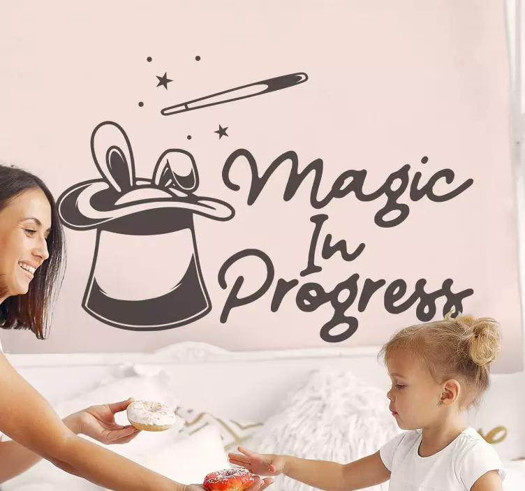 Reference: A46987An enchanting scene featuring a magic hat adorned with playful elements like stars and a magic wand, ideal for inspiring creativity. The phrase 'Magic In Progress' adds a whimsical touch, capturing the joy of childhood imagination. Perfect for a cheerful space.