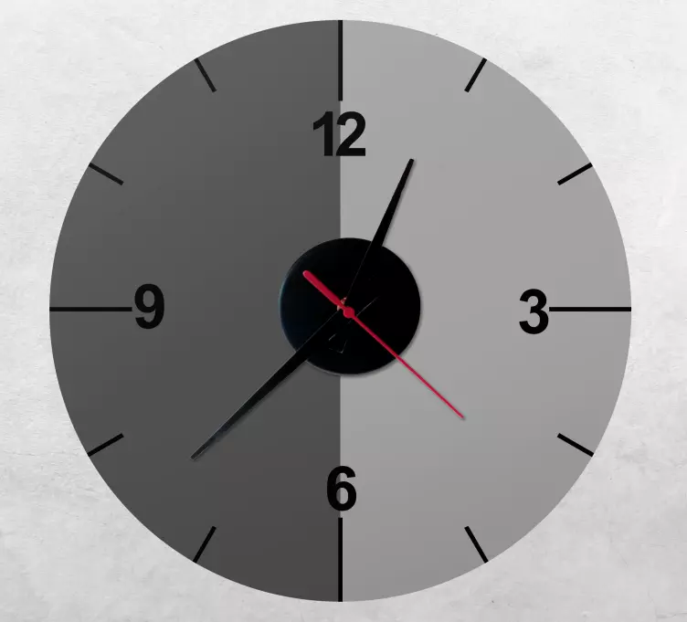 Reference: A49334A sleek timepiece featuring a minimalist design split between light and dark grey tones. The bold hour markers and contrasting clock hands create a striking visual effect, perfect for adding a touch of modern elegance to any space.