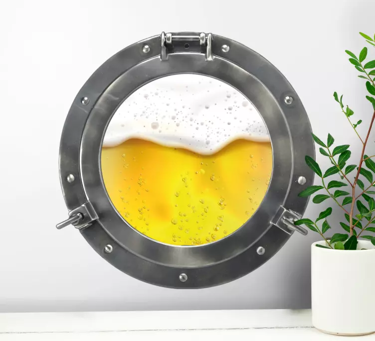 Reference: A49056A creative depiction showcasing a porthole filled with a refreshing golden brew. The design captures the essence of a lively atmosphere, making it perfect for kitchens or bars. The frothy top and sparkling bubbles bring a touch of excitement to any space.