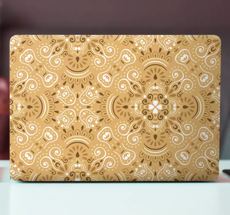 The Elegant Ornate Pattern laptop skin features a stunning design with a beige backdrop adorned by intricate ornamental swirls and geometric shapes. This decorative pattern effortlessly transforms your laptop into a work of art, blending sophistication with a touch of whimsy. Enhance your device's aesthetic with this unique, eye-catching design that reflects your style!