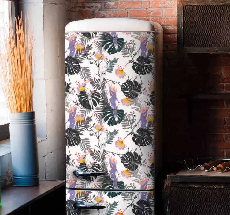 Reference: A53784A vibrant tropical floral pattern featuring cockatoos among lush leaves and colorful flowers. This design brings a lively and exotic touch, perfect for elevating the aesthetic of any space.