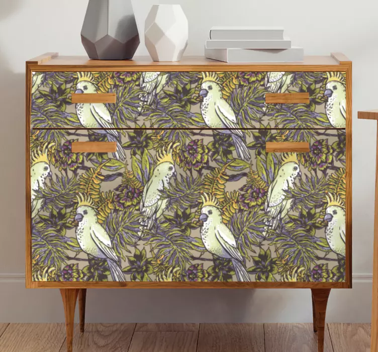 Transform your living space with our Furniture sticker lively bird inspired design, featuring vibrant illustrations of parrots among lush leaves and colorful tropical flowers. This delightful pattern captures the essence of nature and flora, bringing a cheerful atmosphere to any room. Perfectly suited for furniture, this design is a feast for the eyes, inviting warmth and creativity into your home!