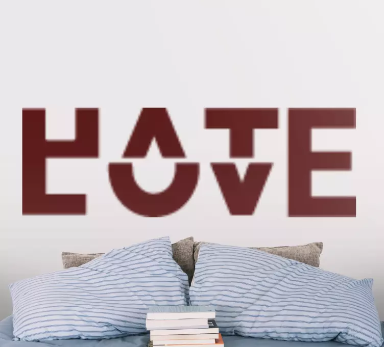 Decorative asymmetric text decal design showing love and hate on opposite sides. The product is self adhesive, making it easy to apply and removable when you want it off.