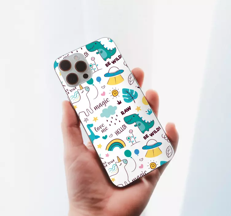 Introducing our delightful iPhone sticker whimsical creature designs, where vibrant colors and enchanting graphics come together to create a magical visual experience! This unique design showcases adorable dinosaurs and playful unicorns in a fun pattern that brings a touch of fantasy to your phone. With its cute and colorful illustrations, this iPhone sticker will surely spark joy and creativity every time you glance at your device!