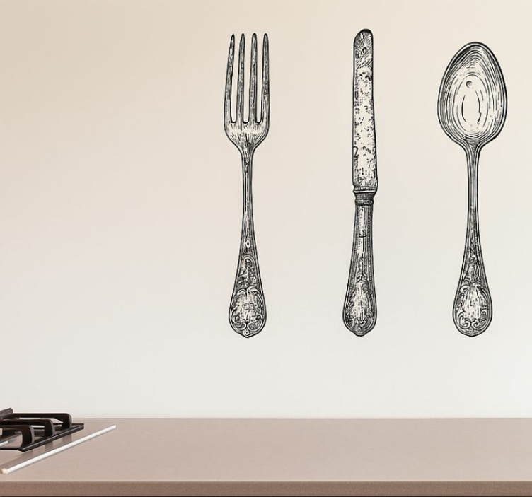 Reference: A54290Transform your kitchen with our stunning Kitchen wall sticker grey cutlery design! This exquisite design features elegantly arranged cutlery in a sleek grey tone, creating a harmonious blend of style and functionality. The intricate detailing of forks, knives, and spoons provides a contemporary touch that enhances any space, making it perfect for modern homes.