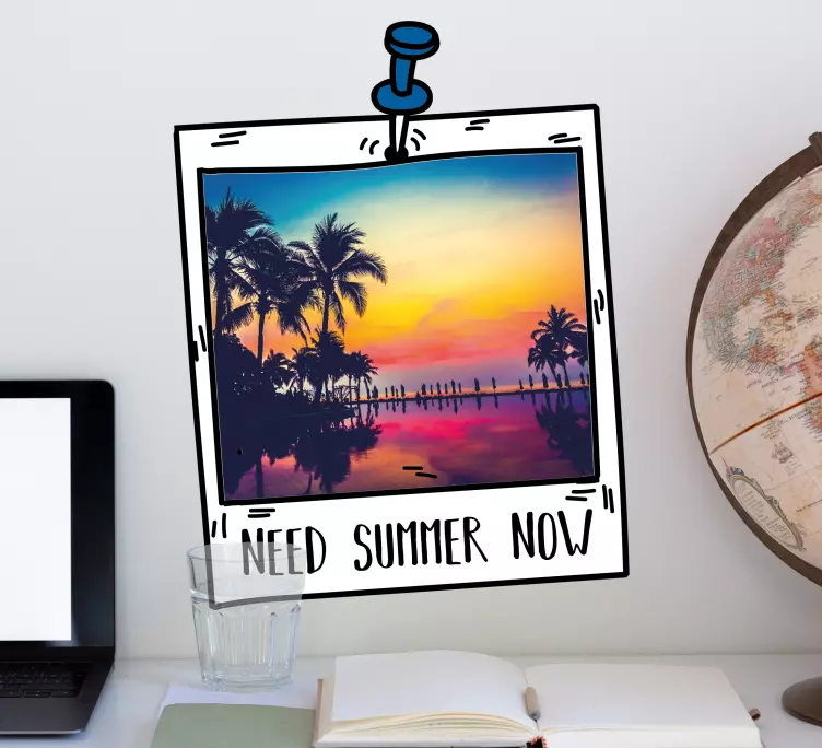 Transform your space with the stunning Nature wall sticker summer landscape frame. This captivating design features a delightful polaroid-style photograph of a beach sunset, capturing the essence of summer vibes. With palm trees swaying gently in the evening breeze and the warm glow of the sunset, this sticker brings a refreshing touch of nature into your home. The text overlay adds a contemporary flair, making it a perfect addition to any room that needs a splash of color and positivity!