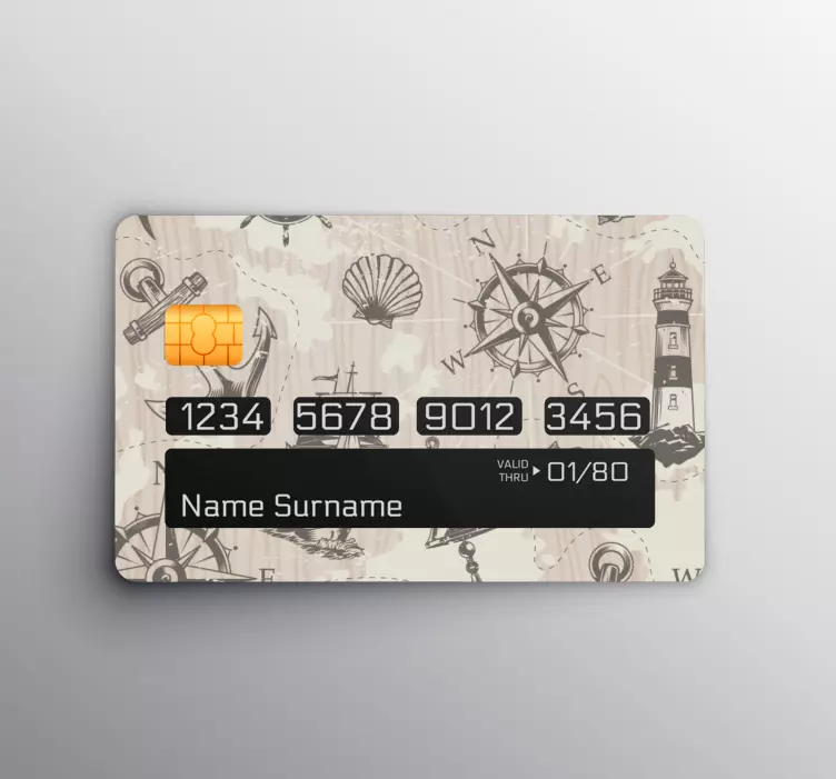 Transform your credit card with our Nautical themed card credit card sticker, featuring a captivating design that blends elements of the sea. With illustrations of anchors, wood, nautical maps, a charming lighthouse, shells, and a compass, this sticker embodies the spirit of adventure and exploration. It’s perfect for those who love the ocean and want to showcase their passion in a stylish way!