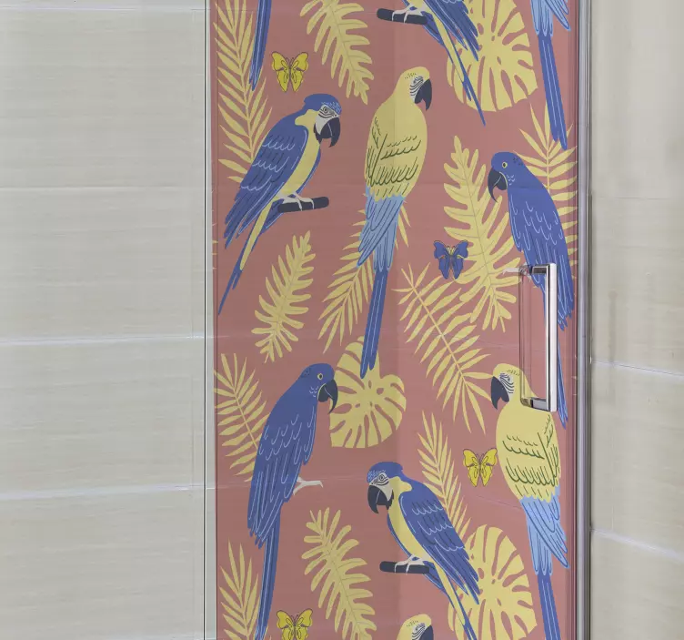 Transform your bathroom into a vibrant tropical paradise with our Shower screen sticker colorful parrots design. This stunning design features magnificent macaws in brilliant yellow and blue hues, surrounded by lush leafy patterns and delicate butterflies. The lively imagery captures the essence of nature, bringing a touch of the tropics right into your home. Each element is thoughtfully crafted to create a harmonious and eye-catching display that will delight all who enter.