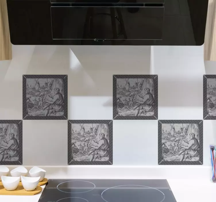 Transform your space with our stunning Tile sticker historic scene decals. These artistic designs showcase a captivating landscape featuring working men and historic mills, all rendered in a striking black and white palette. Each decal reflects exquisite craftsmanship, bringing a cultural touch to any room. Perfect for anyone looking to add character and history to their decor!