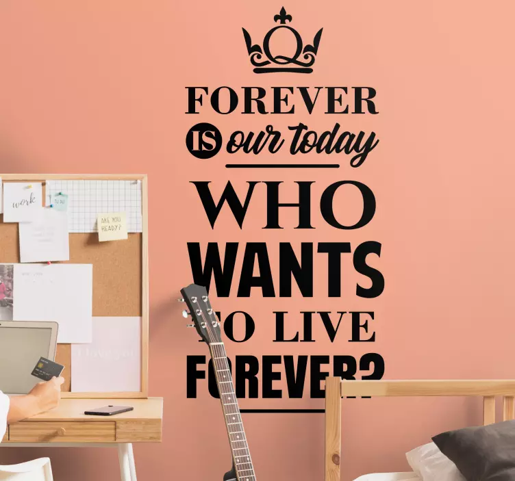 Transform your space with our stunning Wall decal quotes who wants to live forever. This beautifully designed piece features inspiring song lyrics, evoking a sense of forever through music and text. The monochrome typography adds a modern touch, making it a perfect statement piece for any room.