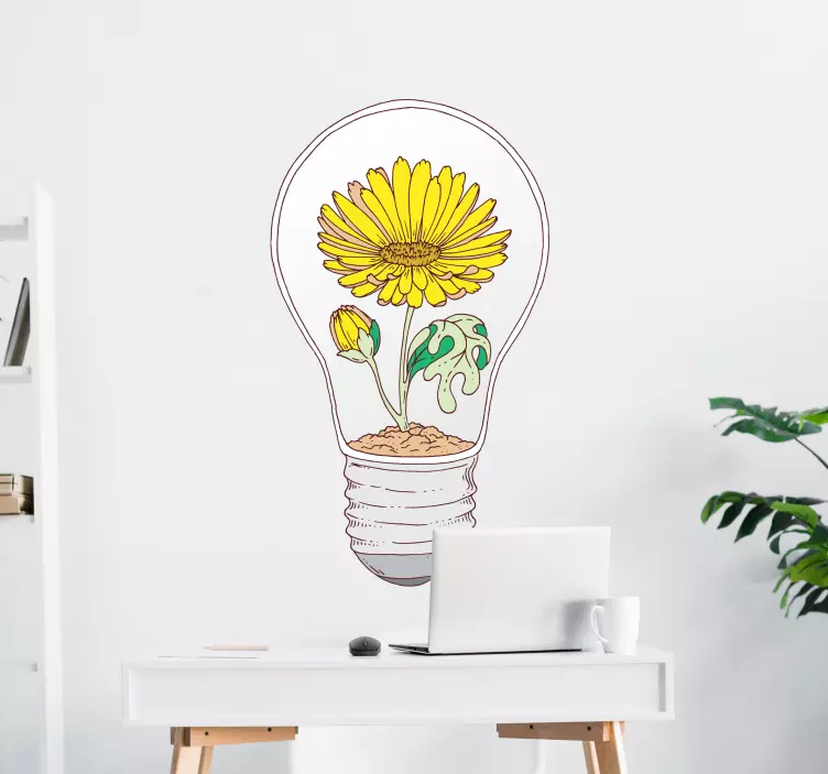 Introducing our stunning Wall sticker blooming light bulb, a captivating design that features a radiant lightbulb intertwined with vibrant sunflowers and delicate leaves, symbolizing growth and the beauty of nature. This conceptual illustration in bright yellow brings a fresh, cheerful vibe to any space, making it a perfect addition to your home or office decor!