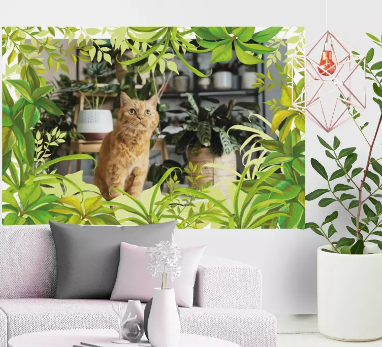 Reference: A48313A charming scene featuring an attentive cat surrounded by lush greenery. The design captures the essence of nature intertwined with home comfort, showcasing the cat's curious demeanor amidst a variety of indoor plants.