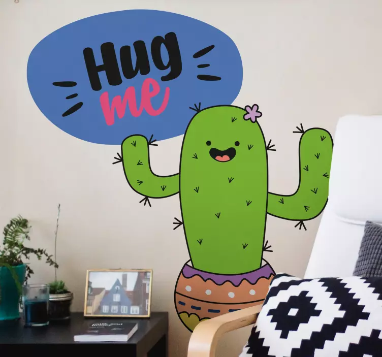 Reference: A46921A cheerful cactus character with a friendly smile, adorned with a vibrant flower and colorful pot. It features a playful speech bubble with the text encouraging hugs, adding a light-hearted touch to the overall design.