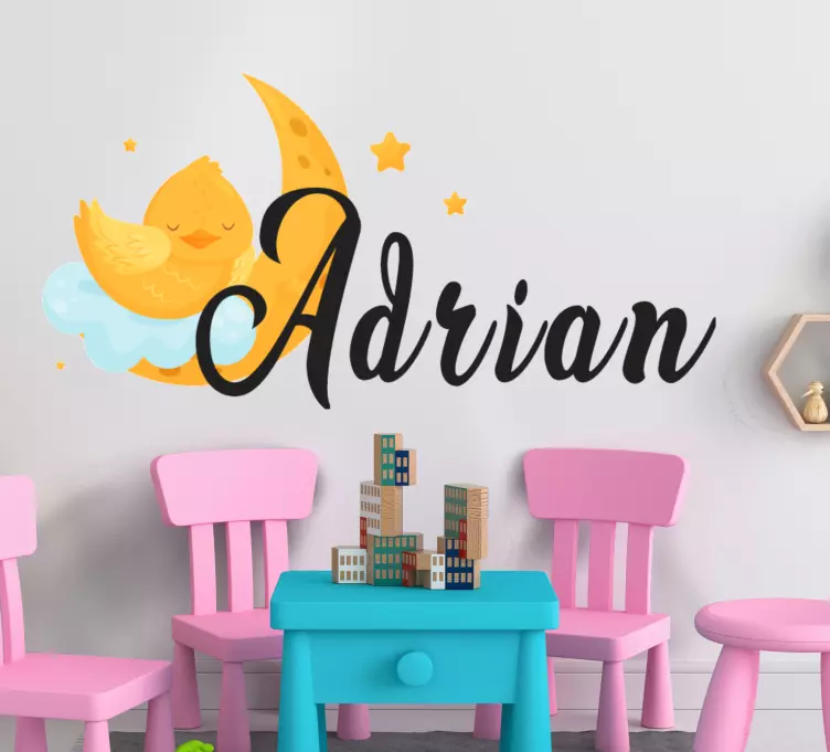 Transform your child's space with our enchanting Wall stickers for kids cute moon design. This delightful design features a charming chick nestled against a serene moon, creating a whimsical atmosphere that's perfect for a kids room. With elements like sleeping stars and fluffy clouds, each sticker is a beautiful illustration that allows you to add a custom name or personal touch, making it the ideal addition to any childrens room or baby nursery!