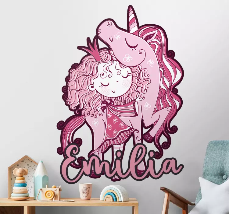 Transform your child's space into a whimsical wonderland with our Wall stickers for kids pink unicorn embrace. This enchanting design features a delightful cartoon princess embracing a magical unicorn, perfect for igniting the imagination of any little girl. The customizable aspect allows you to include your child's name, making it a truly personal addition to their fantasy realm!