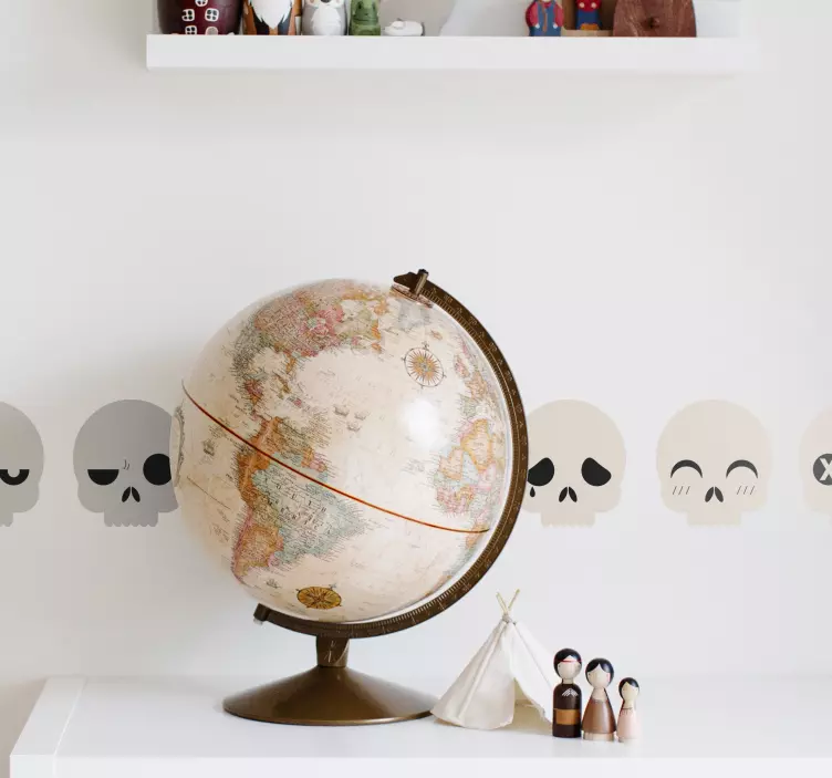 Introducing our Whimsical skull faces wall sticker, a delightful blend of graphic artistry featuring playful pirate characters and expressive skull designs. This decorative piece adds a touch of personality and charm to any space with its captivating border and imaginative details that make it a standout choice for enhancing your home decor!
