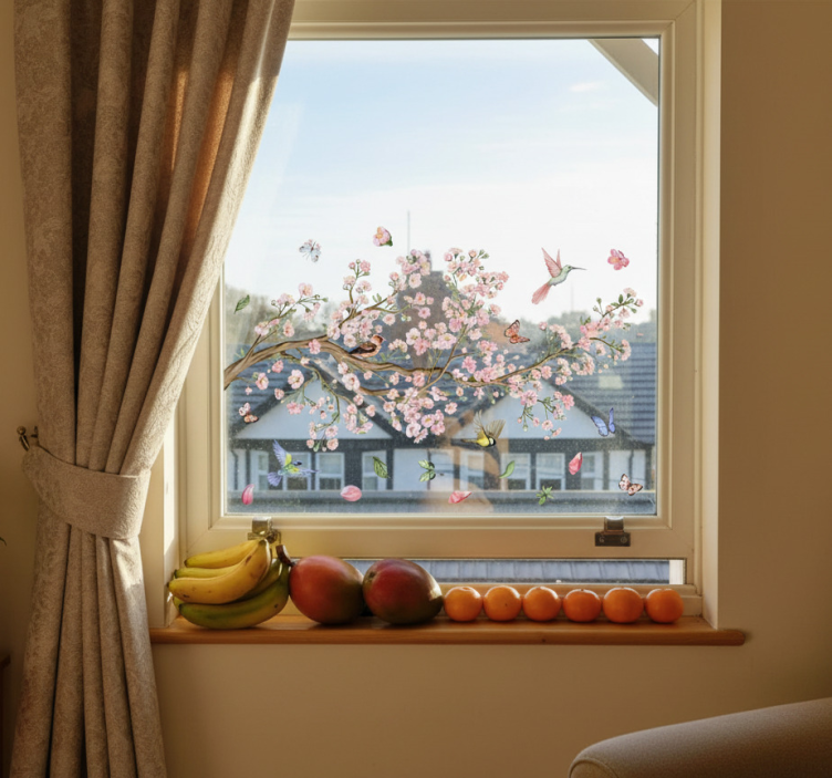 Reference: A53277Enhance your space with our stunning Window sticker cherry blossom with birds. This beautiful design features delicate cherry blossoms and charming birds, bringing a touch of nature to your home. The satin finish ensures that there are no reflections from indoor or outdoor light, allowing you to fully appreciate the vibrant colors without glare. Made with high-quality materials, this sticker is durable, washable, and easy to apply, making it the perfect addition to any flat surface!