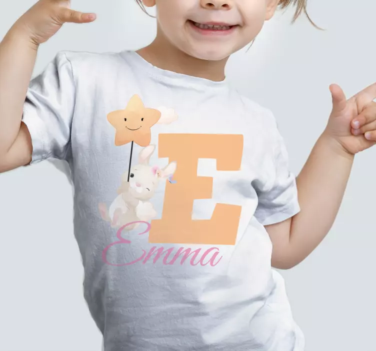 Reference: T4701This charming design features a cheerful bunny holding a star balloon, accompanied by the letter 'E' and a personalized name. Perfect for special occasions, it radiates joy and playfulness, making it an ideal choice for little ones.