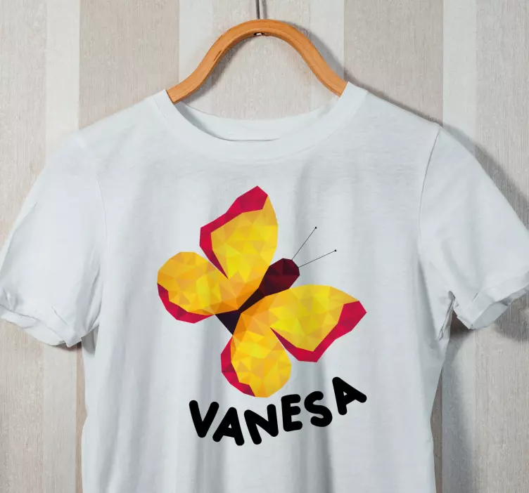 Reference: T4993This charming design features a vibrant butterfly with a dazzling blend of yellow and red tones. The geometric shapes add a modern touch, while the bold lettering of the name enhances its personal appeal. Perfect for showcasing a cheerful and playful vibe.