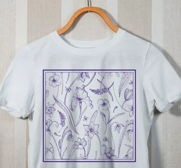 Introducing our stunning Botanical Motif Arrangement T-Shirt, featuring a captivating design that brings the beauty of nature to life! This exquisite t-shirt showcases an intricate illustration of crocus flowers in a vibrant purple hue, surrounded by a delightful pattern of florals that dance across a pattern background. Each sketch is a celebration of art and nature, making it a perfect addition to your wardrobe for those who appreciate the charm of botanical designs.