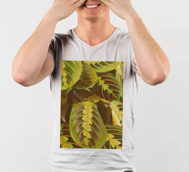 Introducing our stunning Green leaf pattern t-shirt, a vibrant expression of nature that brings the lush beauty of the jungle right into your wardrobe! This unique design features an exquisite illustration of maranta leaves, creating a fresh and exotic botanical look that is truly eye-catching. With its rich textures and vibrant greens, this t-shirt captures the essence of tropical paradise, making it a perfect addition to your casual collection.