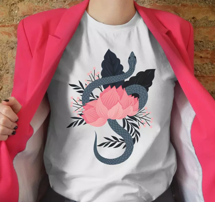 The Snake and flower motif t-shirt showcases a stunning design that intertwines the elegance of a snake with the beauty of a lotus flower. Featuring stylized leaves and petals in a vibrant pink against a sleek black background, this botanical masterpiece captures the essence of nature in a modern and artistic way. The unique combination of elements creates a visual feast that is sure to turn heads and make a statement!