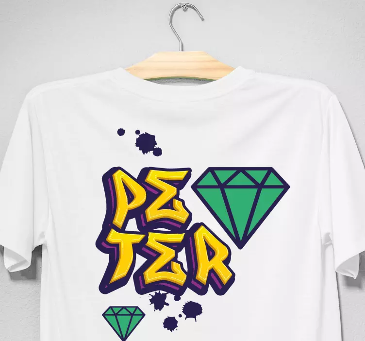 Introducing our T-shirt with name peter diamond design, a vibrant masterpiece that captures the essence of urban art! This stunning design features an eye-catching blend of graffiti, street art, and colorful elements that reflect a playful spirit. With a unique custom touch, this shirt allows you to express your individuality, showcasing your name in a stylish diamond motif. The fusion of paint and urban aesthetics makes it a must-have for anyone who loves graffitti and wants to stand out!