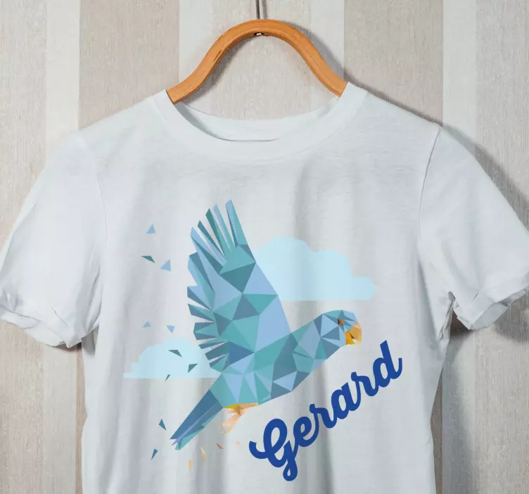 Reference: T4986This design features a geometric representation of a parrot in flight, complemented by soft clouds. The vibrant blue tones create a dynamic appearance, while the name 'Gerard' adds a personal touch. Perfect for those who appreciate unique and eye-catching artwork.