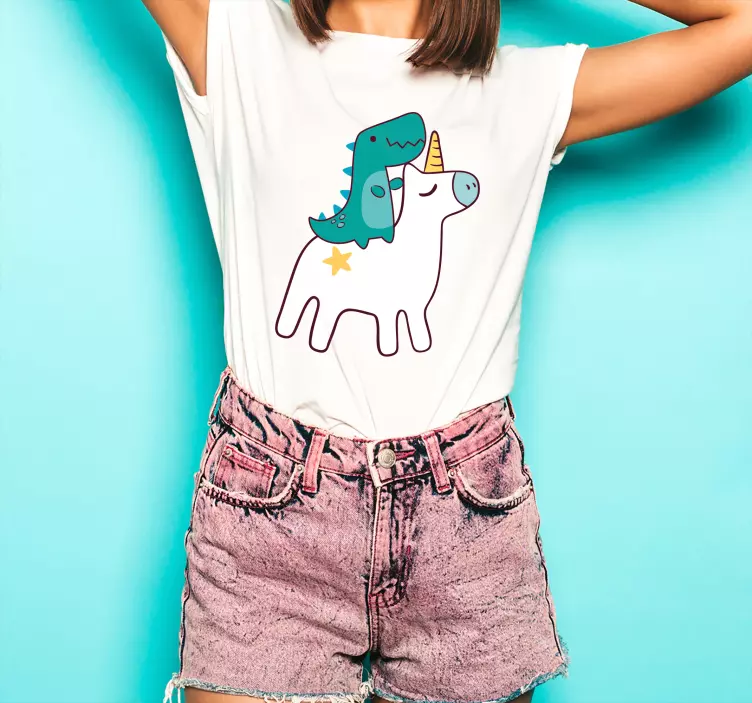 Introducing our Whimsical unicorn adventure t-shirt, a vibrant and playful garment that features an enchanting illustration of a unicorn and a friendly dinosaur surrounded by colorful stars. This cartoon-inspired design is perfect for those who love cute and imaginative graphics, making it a delightful addition to any wardrobe!