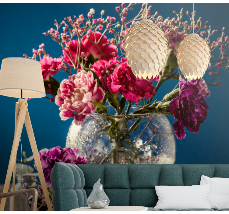 Introducing our stunning Flower mural lively bloom arrangement, a captivating design that brings the beauty of nature indoors! This exquisite mural features vibrant clove and carnation flowers, delicately arranged in a glass vase, with droplets adding a refreshing touch. The flora comes alive in a symphony of colors, making it the perfect centerpiece for any wall.