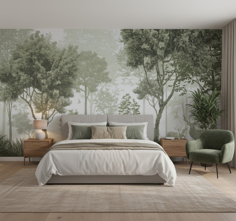 Reference: F11909Transform your space with the Forest wall mural tranquil nature escape, a stunning design that encapsulates the serene beauty of nature. This mural features a breathtaking forest landscape, where lush trees meet soft, calming hues that evoke a sense of tranquility and peace. The artwork is crafted in matt colours, allowing it to blend seamlessly into any room, creating a soothing atmosphere that invites relaxation.