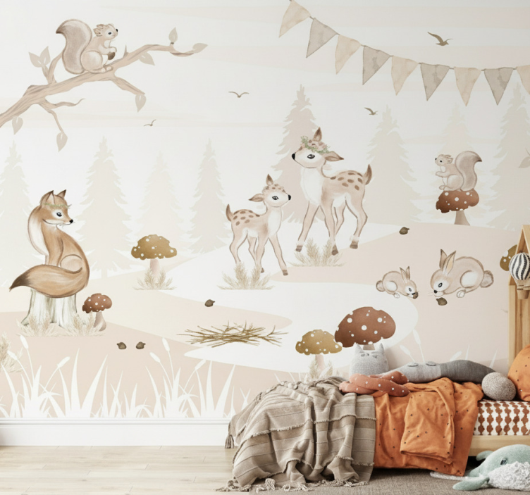 Reference: F11906Transform your child's nursery into a magical retreat with our Forest wall mural whimsical woodland nursery. This enchanting design features delightful woodland creatures amidst lush greenery, creating a serene atmosphere perfect for nurturing your little one's imagination. The mural is crafted in beautiful matt colours using high-quality non-woven wallpaper, ensuring a vibrant and lasting addition to any nursery.
