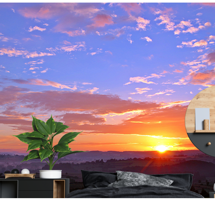 Transform your space with our captivating Landscape mural wallpaper sunset over hills, where the beauty of nature comes alive. This stunning design features a breathtaking sky adorned with fluffy clouds that gracefully drift above majestic mountains. As the sun sets on the horizon, the warm hues of the landscape create an inviting atmosphere that brings tranquility and inspiration into your home. Experience the harmonious blend of photography and artistry that captures the essence of a serene sunset over rolling hills, making it a perfect choice for any room!