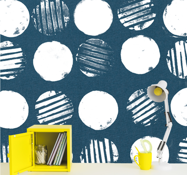 Reference: F12130This design features a captivating arrangement of circles, some solid and others with striped patterns, all set against a deep blue background. The variation in texture adds depth, creating a modern and artistic visual that enhances contemporary aesthetics.